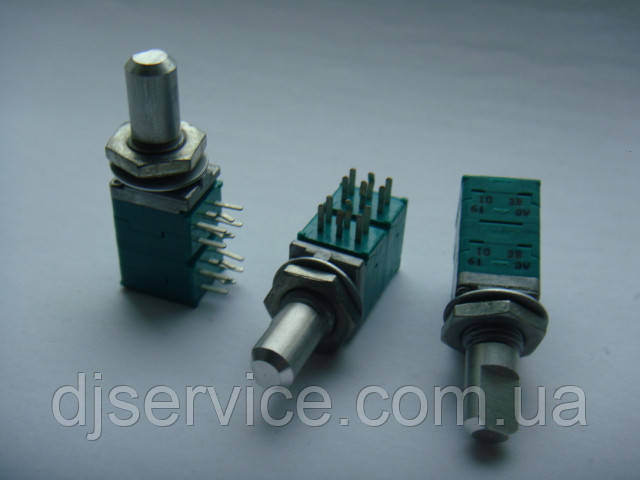 потенціометр ALPS (горизонтальний) номинал b10k, заввишки вала 15 мм, 4 ряди по 3 ніжки, без середньої точки